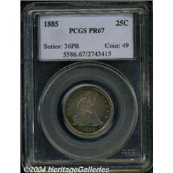 <B>1885<25C> PR67 PCGS.</B></I> Sharply struck in the centers with unquestionable originality, the watery surfaces are richly toned in dominant crimson-rose, turquoise-blue, and lime-gold shades. Direct angles reveal multicolored overtones in copper and soft gray shades. The low mintage 1885 was produced to the extent of just 14,350 pieces, 930 coins of which were proofs. A remarkably preserved Superb example. Population: 13 in 67, with a mere two finer.<BR><I>Ex: Long Beach Signature Sale (Heritage, 6/01), lot 8161, which realized $5,865.</B></I><BR><I>From the JFS Collection.</B></I> <BR><BR><B>Important notice:</B> Heritage usually auctions material at the rate of 200-250 lots per hour. On some occasions eBay Live bid software or the Internet may not be able to keep up with the pace of the auction. We recommend placing a realistic absentee bid now as insurance to avoid disappointment. Occasionally the auctioneer may eliminate or reject an eBay Live bid, and the auctioneer may also reopen a lot after the close of the eBay live bidding (usually because we missed an audience bid), and may reject your bid even if it shows you as the winning bidder. By bidding via eBay Live, you agree that Heritage may award the lot to another bidder at its sole discretion under the circumstances described above or any other reasonable circumstances. Since eBay bids are not shown to us until we open the lot on the floor, we treat those bids just like floor bids. In most cases the floor responds before the eBay bid is presented to us, due to Internet lag time, so for consistency we have made it a policy that floor bids are always considered first over tie eBay live bids. Also please note that all Heritage lots purchased through eBay Live carry a 20% Buyer's Premium. Please make sure you read the Terms and Conditions before you bid. </span></font></tr></table></td></tr></table>