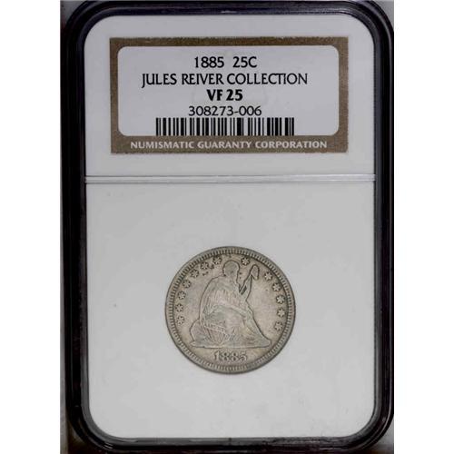 <B>1885<25C> VF25 NGC.</B></I> Briggs 2-A. Mostly slate-gray in color, with a hint of ebony debris here and there. IN and the S in TRUST are weak, but the legends, including LIBERTY, are otherwise sharp. Dimes and Silver Dollars were coined in quantity in 1885, but Quarters and Half Dollars continued their recent year pattern of limited production. A mere 13,600 commercial strikes fell from the dies.