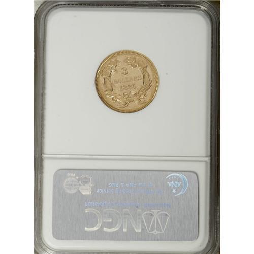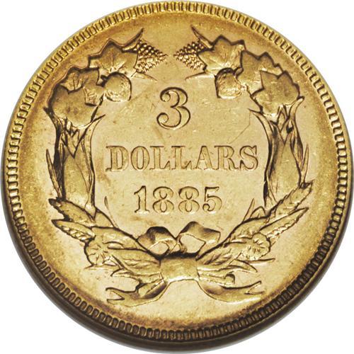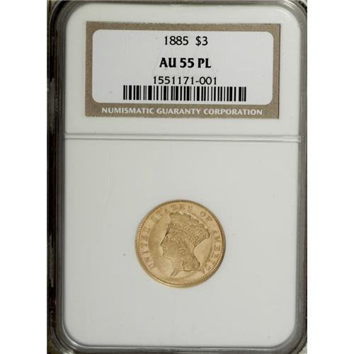 <B>1885 $3 AU55 Prooflike NGC.</B></I> Bright prooflike luster dominates the obverse border and the wreath. The eye appeal is suggestive of a finer grade. A lightly circulated but completely problem-free representative of this ultra-low mintage date. Just 801 business strikes and 109 proofs were produced.<BR><BR><b>Shipping:</b> Coin/Currency (<a target="_blank" href="http://www.heritageauctions.com/common/shipping.php">view shipping information</a>)