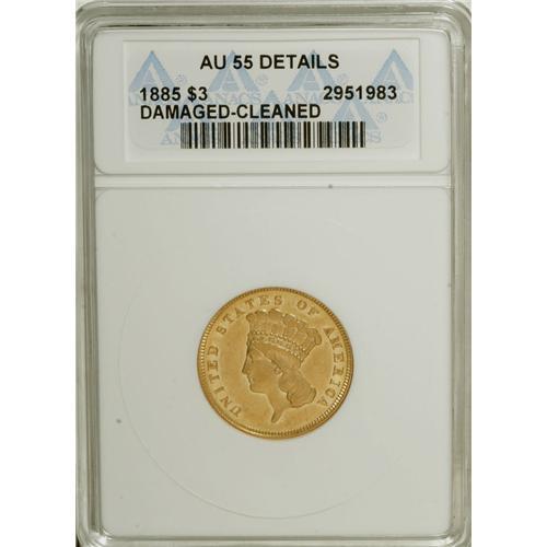 <B>1885 $3 --Damaged, Cleaned--ANACS. AU55 Details.</B></I> Only mildly cleaned, and the few short, thin marks on the upper reverse are less distracting than the ANACS notations imply. An unimportant rim nick is noted at 7 o'clock on the reverse. Only 801 business strikes were issued. Karl Stecher, Sr. purchased this piece from the Guttag Bros. of New York during the 1930s.<BR><I>From The Stecher Collection, Part Two.</B></I><BR><BR><b>Shipping:</b> Coins & Currency (<a target="_blank" href="http://www.heritageauctions.com/common/shipping.php">view shipping information</a>)