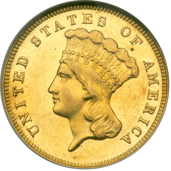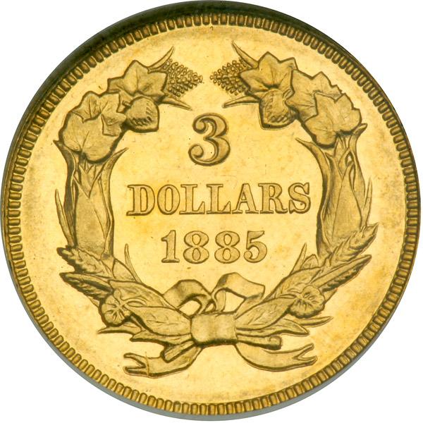 1885 $3 Gold. NGC graded Proof 58. A hint of light tone. One tiny mark below the F in Of on the obverse. Only 109 struck. The $3 denomination was designed by James B. Longacre, who became chief engraver at the Mint in 1844, after the death of Christian Gobrecht. The obverse features the head of an Indian princess, facing left, wearing a feathered headdress upon which is a band inscribed LIBERTY. The inscription UNITED STATES OF AMERICA surrounds. The same motif was later used on the Type III gold dollar 1856-1889.