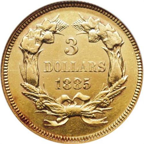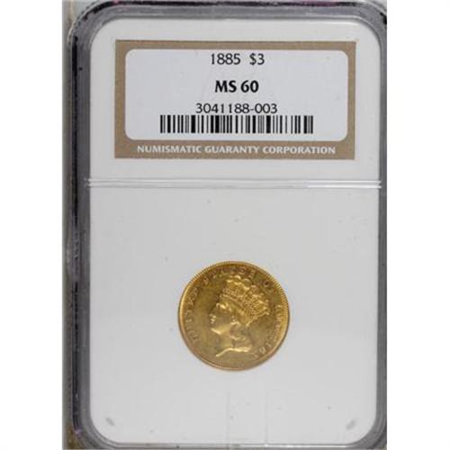 <B>1885 $3 MS60 NGC.</B></I> Many three dollar dates have low mintages, but even within this elusive company, the production of the 1885 stands out. Only 801 business strikes were coined, along with 109 proofs. Although one expects an MS60 example to be scuffy, the present piece is pleasantly unabraded, and bright luster shimmers from the designs and legends.<BR><BR><B>Coin Engraver:</B> James B. Longacre<BR><BR><b>Shipping:</b> Coins & Currency (<a target="_blank" href="http://www.heritageauctions.com/common/shipping.php">view shipping information</a>)