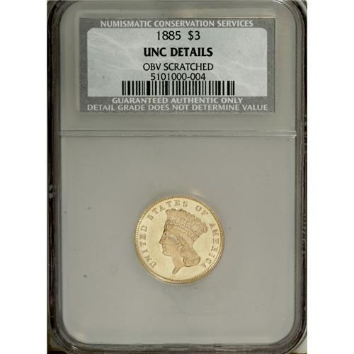 <B>1885 $3 --Obverse Scratched--NCS. Unc. Details.</B></I> The three dollar series is loaded with low mintage dates. Nonetheless, the 1885 stands out, since only 801 business strikes and 109 proofs were struck. The present representative has lustrous devices and borders. A thin horizontal mark from the nose to error confirms the NCS designation.<BR><BR><b>Shipping:</b> Coins & Currency (<a target="_blank" href="http://www.heritageauctions.com/common/shipping.php">view shipping information</a>)