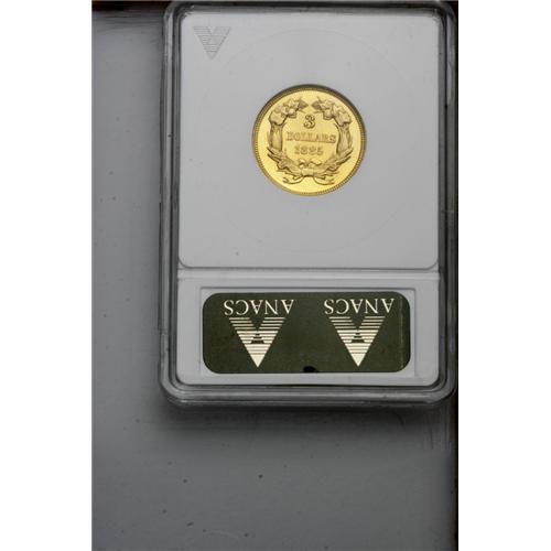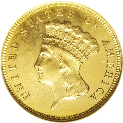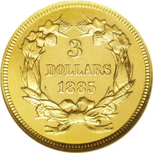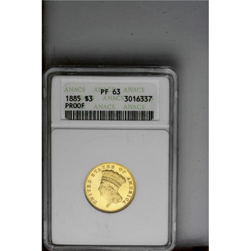 <B>1885<$3> PR63 ANACS.</B></I> The 1885 is a low total-mintage date with only 801 business strikes and 109 proofs produced. Probably no more than 40 proofs are extant today in all grades. This is a sparkling, orange-tinted specimen with uniform, mirrored brilliance and a few scattered blemishes and hairlines. Some light, hazy patina is seen over each side and a light bit of porosity is present in the fields. An excellent choice for both the type and date collector, this date would make an interesting proof type coin because of its better date status.