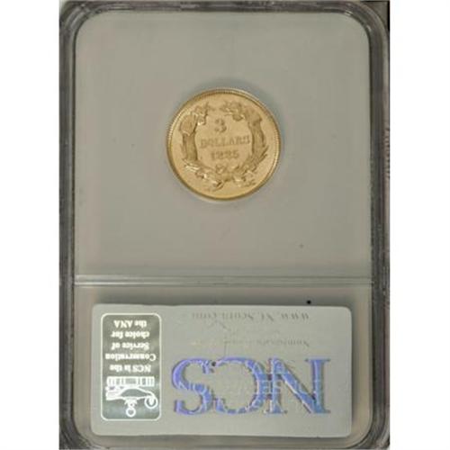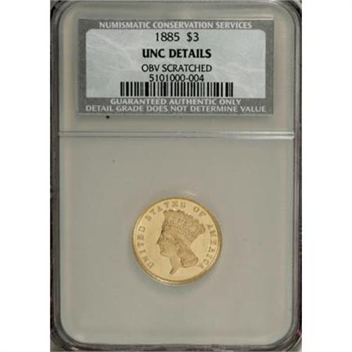 <B>1885 $3 --Obverse Scratched--NCS. Unc. Details.</B></I> The three dollar series is loaded with low mintage dates. Nonetheless, the 1885 stands out, since only 801 business strikes and 109 proofs were struck. The present representative has lustrous devices and borders. A thin horizontal mark on the cheek confirms the NCS designation.<BR><BR><B>Coin Engraver:</B> James B. Longacre<BR><BR><b>Shipping:</b> Coins & Currency (<a target="_blank" href="http://www.heritageauctions.com/common/shipping.php">view shipping information</a>\)