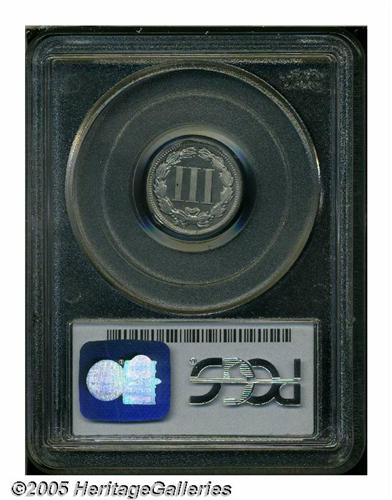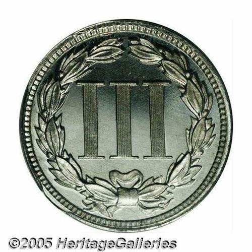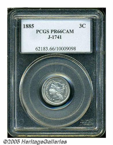 <B>1885<3C> Three Cent Nickel, Judd-1741, Pollock-1953, High R.7, PR66 PCGS.</B></I> A trail piece struck with regular dies, obverse and reverse. Struck in aluminum with a plain edge. At first glance, this appears to be a regular Three Cent nickel piece, but a very thin film of oxidation is seen on the surfaces under close examination. A rare pattern issue.<BR><I>From The Western Hills Collection.</B></I>