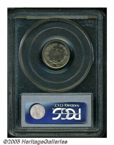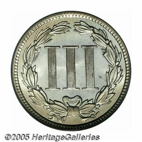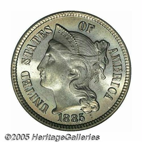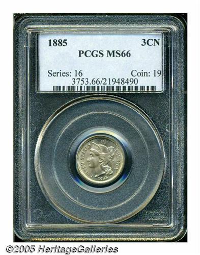 <B>1885<3CN> MS66 PCGS.</B></I> A lovely, well frosted example that benefits from delicate sky-blue and golden-orange accents. Both the strike and luster on this briefly minted business strike (a mere 1,000 pieces) are strictly first rate. Population: 8 in 66, 2 finer (4/05).<BR><I>From The Western Hills Collection.</B></I>