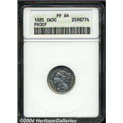 <B>1885<3CN> PR64 ANACS.</B></I> Essentially untoned with bright, watery mirrors. A shallow planchet flaw (as struck) resides between the second 8 and the 5 in the date, and another rests on and just above the D in UNITED. The only apparent grade-limiting defect is a tiny ding near the center of the second Roman numeral I. A low total mintage date.<BR><I>From the Virgil Farstad Collection, Part Two.</B></I> <BR><BR><B>Important notice:</B> Heritage usually auctions material at the rate of 200-250 lots per hour. On some occasions eBay Live bid software or the Internet may not be able to keep up with the pace of the auction. We recommend placing a realistic absentee bid now as insurance to avoid disappointment. Occasionally the auctioneer may eliminate or reject an eBay Live bid, and the auctioneer may also reopen a lot after the close of the eBay live bidding (usually because we missed an audience bid), and may reject your bid even if it shows you as the winning bidder. By bidding via eBay Live, you agree that Heritage may award the lot to another bidder at its sole discretion under the circumstances described above or any other reasonable circumstances. Since eBay bids are not shown to us until we open the lot on the floor, we treat those bids just like floor bids. In most cases the floor responds before the eBay bid is presented to us, due to Internet lag time, so for consistency we have made it a policy that floor bids are always considered first over tie eBay live bids. Also please note that all Heritage lots purchased through eBay Live carry a 20% Buyer's Premium. Please make sure you read the Terms and Conditions before you bid.