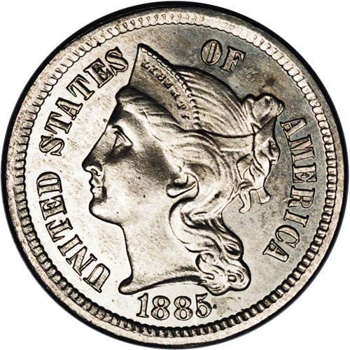 <B>1885<3CN> PR64 NGC.</B></I> Delicate champagne iridescence. The devices are sharp with a texture intermediate between frosty and satiny. The fields are glittering mirrors. A tiny planchet flaw can be seen between the 2nd 8 and the 5 in the date, as made. A few trivial flecks are noted.