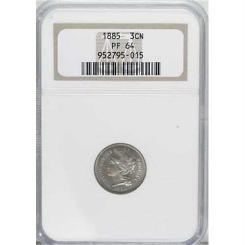 <B>1885 3CN PR64 NGC.</B></I> NGC Census: (218/436). PCGS Population (357/444). Mintage: 3,790. Numismedia Wsl. Price for NGC/PCGS coin in PR64: $372. (#3781)<BR><BR><b>Shipping:</b> Coins & Currency (<a target="_blank" href="http://www.heritageauctions.com/common/shipping.php">view shipping information</a>)