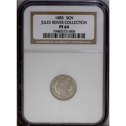 <B>1885<3CN> PR64 NGC.</B></I> Warm golden-gray toning. The devices are frosty, while the mirror-quality of the fields is partially subdued, possibly because of the toning. Envelope Included.