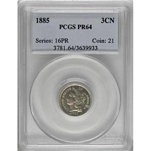 <B>1885 3CN PR64 PCGS.</B></I> PCGS Population (361/443). NGC Census: (219/437). Mintage: 3,790. Numismedia Wsl. Price for NGC/PCGS coin in PR64: $350. (#3781)<BR><BR><B>Coin Engraver:</B> James B. Longacre<BR><BR><b>Shipping:</b> Coins & Currency (<a target="_blank" href="http://www.heritageauctions.com/common/shipping.php">view shipping information</a>)