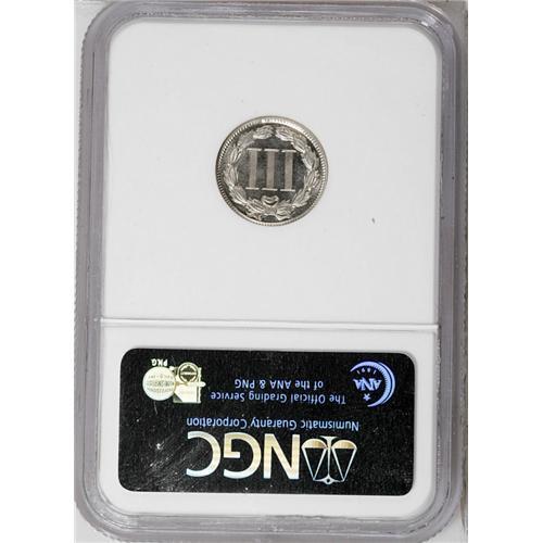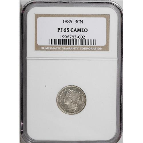 <B>1885<3CN> PR65 Cameo NGC.</B></I> Deeply mirrored silver-gray fields contrast well with the frosted devices. Tiny flecks of carbon and a planchet flaw near the D of UNITED are noted on the obverse.