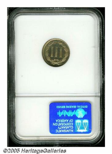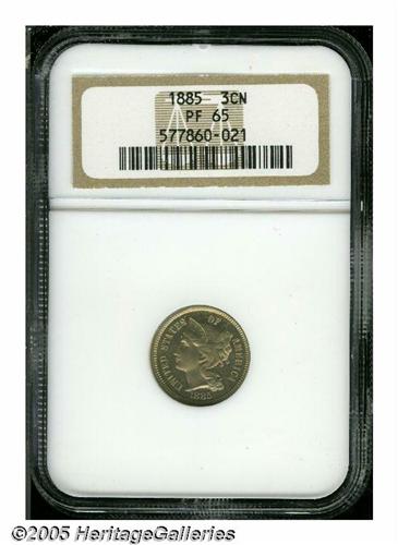 <B>1885<3CN> PR65 NGC.</B></I> Lovely rose-golden example with hints of green color. Lint marks are noted above Liberty's bun and on the reverse above the bow. The strike is above average.