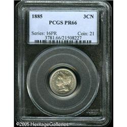 <B>1885 3CN PR66 PCGS.</B></I> Glowing luster lies beneath a thin layer of faint silver-gray patina. The design elements are well struck, with sharp definition in the lines of the III. A couple of small ticks on Liberty's cheek are not particularly bothersome.<BR><I>From The Mike Jacobson Collection.</B></I> Lot:5763