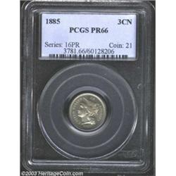 <TABLE cellSpacing=0 cellPadding=0 width="100%" bgColor=#000000 border=0><TBODY><TR><TD width="100%"><TABLE cellSpacing=1 cellPadding=3 width="100%" border=0><TBODY><TR><TD width="100%" bgColor=#79735c><FONT face=arial color=#ffffff size=3><B>Description</B> </FONT></TD></TR><TR><TD width="100%" bgColor=#ffffff><FONT face=arial size=2><B>1885 3CN PR66 PCGS.</B></I> Fully struck and exquisitely preserved, with a few flyspecks on the reverse. The fields are modestly reflective on the reverse, while the obverse fields seem to be subdued by a coating of silver-gray patina. </FONT></TD></TR></TBODY></TABLE></TD></TR></TBODY></TABLE><BR><A name=PricesRealized></A><TABLE cellSpacing=0 cellPadding=0 width="100%" bgColor=#000000 border=0><TBODY><TR><TD width="100%"><TABLE cellSpacing=1 cellPadding=3 width="100%" border=0><TBODY><TR><TD width="100%" bgColor=#79735c><A name=PR><FONT face=arial color=#ffffff size=3><B>Previous Prices from Heritage Auctions</B> </FONT></A></TD></TR><TR><TD bgColor=#f6f6ed><TABLE cellSpacing=0 cellPadding=0 width="100%" border=1><TBODY><TR><TD align=middle width="33%"><B>Date</B></TD><TD align=middle width="33%"><B>Service</B></TD><TD align=middle width="33%"><B>Price</B></TD></TR><TR bgColor=whitesmoke><TD width="33%"><B>06/06/1998</B></TD><TD width="33%">PCGS</TD><TD width="33%">$661.25</TD></TR><TR bgColor=whitesmoke><TD width="33%"><B>11/12/1993</B></TD><TD width="33%">PCGS</TD><TD width="33%">$715.00</TD></TR><TR bgColor=whitesmoke><TD width="33%"><B>03/19/2002</B></TD><TD width="33%">PCGS</TD><TD width="33%">$552.00</TD></TR><TR bgColor=whitesmoke><TD width="33%"><B>03/27/2001</B></TD><TD width="33%">PCGS</TD><TD width="33%">$575.00</TD></TR><TR bgColor=whitesmoke><TD width="33%"><B>02/23/2001</B></TD><TD width="33%">NGC</TD><TD width="33%">$488.75</TD></TR><TR bgColor=whitesmoke><TD width="33%"><B>07/30/1994</B></TD><TD width="33%">NGC</TD><TD width="33%">$660.00</TD></TR><TR bgColor=whitesmoke><TD width="33%"><B>06/01/2000</B></TD><TD width="33%">NGC</TD><TD width="33%">$633.00</TD></TR><TR bgColor=whitesmoke><TD width="33%"><B>11/01/1999</B></TD><TD width="33%">NGC</TD><TD width="33%">$776.00</TD></TR><TR bgColor=whitesmoke><TD width="33%"><B>03/01/2003</B></TD><TD width="33%">PCGS</TD><TD width="33%">$632.50</TD></TR><TR bgColor=whitesmoke><TD width="33%"><B>03/01/1999</B></TD><TD width="33%">PCGS</TD><TD width="33%">$702.00</TD></TR><TR bgColor=whitesmoke><TD width="33%"><B>05/01/1999</B></TD><TD width="33%">PCGS</TD><TD width="33%">$748.00</TD></TR><TR bgColor=whitesmoke><TD width="33%"><B>08/06/2003</B></TD><TD width="33%">NGC</TD><TD width="33%">$471.50</TD></TR></TBODY></TABLE></TD></TR><TR><TD bgColor=#ffffff><FONT face=arial size=1 ?>PLEASE NOTE: All prices realized reflect the final hammer price PLUS the buyer's premium in auctions that charge a buyer's premium. Each item has a notation at the top of the listing indicating whether that lot included a buyer's premium. Example: A item that sells with a final hammer price of $100 and a 20% buyer's premium will display with a price realized of $120. All information listed is intended to be as accurate as possible, but errors are possible. Please use this guide carefully and inform us of any inaccuracies. </FONT></TD></TR></TBODY></TABLE></TD></TR></TBODY></TABLE><BR><TABLE cellSpacing=0 cellPadding=0 width="100%" bgColor=#000000 border=0><TBODY><TR><TD width="100%"><TABLE cellSpacing=1 cellPadding=3 width="100%" border=0><TBODY><TR><TD width="100%" bgColor=#79735c colSpan=6><FONT face=arial color=#ffffff size=3><B>Price Guide*</B> </FONT></TD></TR><TR bgColor=#f6f6ed><TD align=middle><B>Grade</B> </TD><TD align=middle><B>Coin World<BR>(Trends)</B> </TD><TD align=middle><B>Numismedia<BR>Retail</B> </TD><TD align=middle><B>Numismedia<BR>Wholesale</B> </TD><TD align=middle><B>Coin<BR>Universe</B> </TD><TD align=middle><B>Heritage<BR>Value Index</B> </TD></TR><TR bgColor=#ffffff><TD align=middle>65</TD><TD align=right>$535.00</TD><TD align=right>$550.00</TD><TD align=right>$440.00</TD><TD align=right>$500.00</TD><TD align=right>$400.13</TD></TR><TR style="FONT-WEIGHT: bold" bgColor=#cccfdd><TD align=middle>66</TD><TD align=right>$725.00</TD><TD align=right>---</TD><TD align=right>$825.00</TD><TD align=right>$750.00</TD><TD align=right>$535.83</TD></TR><TR bgColor=#ffffff><TD align=middle>67</TD><TD align=right>---</TD><TD align=right>---</TD><TD align=right>$1,150.00</TD><TD align=right>$1,450.00</TD><TD align=right>$1,032.50</TD></TR><TR bgColor=#ffffff><TD colSpan=6><FONT size=1>*All information listed is intended to be as accurate as possible, but errors are possible. No item may be returned or refused based on this information which is provided as a service to our customers. You should contact each pricing source directly to determine the accuracy of this information. </FONT></TD></TR></TBODY></TABLE></TD></TR></TBODY></TABLE><BR><TABLE cellSpacing=0 cellPadding=0 width="100%" bgColor=#000000 border=0><TBODY><TR><TD width="100%"><TABLE cellSpacing=1 cellPadding=3 width="100%" border=0><TBODY><TR><TD width="100%" bgColor=#79735c><FONT face=arial color=#ffffff size=3><B>Population Guide</B> </FONT></TD></TR><TR bgColor=#ffffff><TD align=middle><!-- Begin Output of Population Grid--><TABLE cellSpacing=0 cellPadding=0 width="100%" border=0><TBODY><TR><TD vAlign=center><TABLE cellSpacing=0 width="100%" border=1 cellsadding="3"><TBODY><TR><TD vAlign=center><TABLE cellSpacing=0 cellPadding=3 width="100%" border=1><TBODY><TR><TD vAlign=center align=middle bgColor=#f0f1e8 colSpan=2 <CENTER><FONT face=Arial size=2><B>PCGS Pop </B></FONT><CENTER></CENTER></TD><TD vAlign=center align=middle bgColor=#f0f1e8 colSpan=2><CENTER><FONT face=Arial size=2><B>NGC Pop</B></CENTER></FONT></TD></TR><TR><TD vAlign=center><FONT face=Arial size=2>(66)</FONT> </TD><TD vAlign=center align=right><FONT face=Arial size=2>122</FONT> </TD><TD vAlign=center><FONT face=Arial size=2>(66)</FONT> </TD><TD vAlign=center align=right><FONT face=