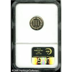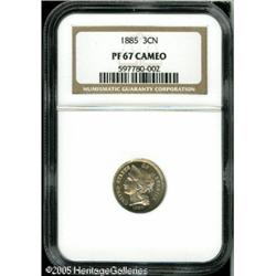 <B>1885 3CN PR67 Cameo NGC.</B></I> This Cameo proof is on the borderline between Cameo and Deep Cameo descriptors. The fields have a satiny accent but still retain considerable reflectivity. Attractive gray luster is accented by wisps of gold color. Population: 6 in 67, 0 finer (1/05).<BR><I>From The Mike Jacobson Collection.</B></I> Lot:5764