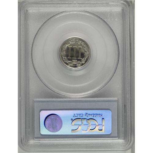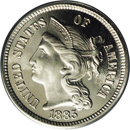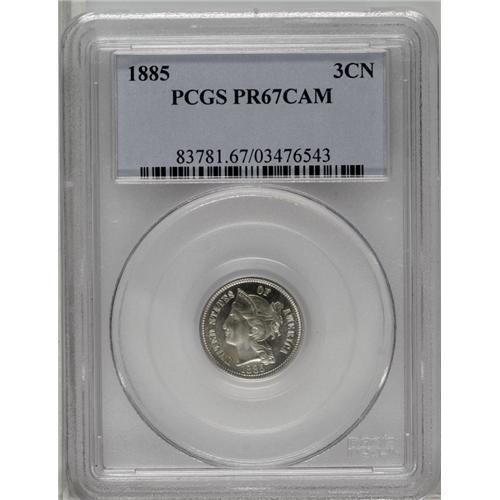 <B>1885<3CN> PR67 Cameo PCGS.</B></I> Wonderfully produced and preserved, with shimmering, untoned mirrored surfaces forming an ideal background for boldly struck design elements. The limited total mintage for this year has always made proofs especially desirable and this specimen is certainly among the elite survivors. Population: 8 in 67 Cameo, 0 finer (3/06). <BR><BR><B>Important notice:</B> Heritage usually auctions material at the rate of 200-250 lots per hour. On some occasions eBay Live bid software or the Internet may not be able to keep up with the pace of the auction. We recommend placing a realistic absentee bid now as insurance to avoid disappointment. Occasionally the auctioneer may eliminate or reject an eBay Live bid, and the auctioneer may also reopen a lot after the close of the eBay live bidding (usually because we missed an audience bid), and may reject your bid even if it shows you as the winning bidder. By bidding via eBay Live, you agree that Heritage may award the lot to another bidder at its sole discretion under the circumstances described above or any other reasonable circumstances. Since eBay bids are not shown to us until we open the lot on the floor, we treat those bids just like floor bids. In most cases the floor responds before the eBay bid is presented to us, due to Internet lag time, so for consistency we have made it a policy that floor bids are always considered first over tie eBay live bids. Also please note that all Heritage lots purchased through eBay Live carry a 20% Buyer's Premium. Please make sure you read the Terms and Conditions before you bid. This lot is being auctioned in conjunction with a live floor auction by Heritage Galleries & Auctioneers. All final auction and invoice information will be supplied by Heritage Galleries & Auctioneers, and all other information should be considered preliminary. Lot:829 <BR><BR><B>Winning Notification and Billing:</B> After the FINAL session in this auction is complete, Heritage will send e-mail and snail mail invoices. This process normally takes several days. All final auction and invoice information will be supplied by Heritage Galleries & Auctioneers, and all other information should be considered preliminary. <BR><BR>This auction will be conducted on a live auction floor and over the Internet through eBay Live. If you choose to place an absentee bid, please take a moment to <font color='#0000ff'><u><a href='http://pages.ebay.com/liveauctions/help/before/laabsentee.html'>learn how eBay Live absentee bidding works</a></u></font><font color='#000000'>