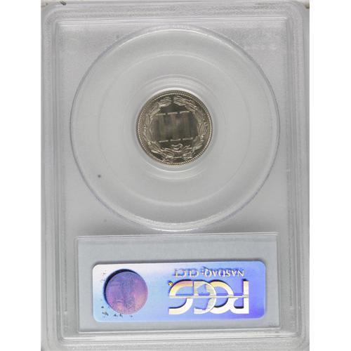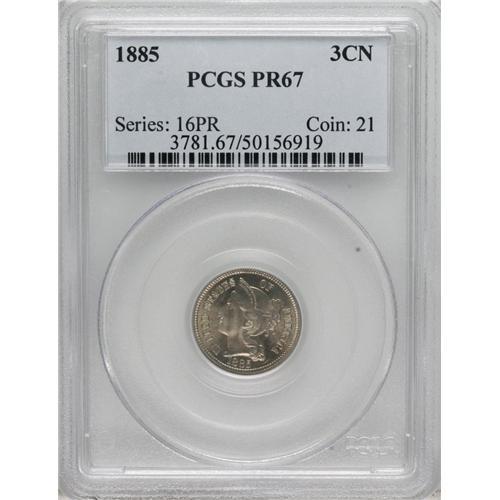 <B>1885 3CN PR67 PCGS.</B></I> The 1885 three and five cent business strike nickels are each the key to their respective series, and both frequently call on proofs to fill in those missing holes. Bright proof surfaces reveal speckles of light tan toning and are impeccably preserved. The design features are well impressed throughout. Population: 26 in 67, 1 finer (4/07).<BR><BR><b>Shipping:</b> Coins & Currency (<a target="_blank" href="http://www.heritageauctions.com/common/shipping.php">view shipping information</a>)