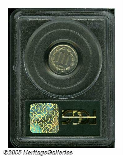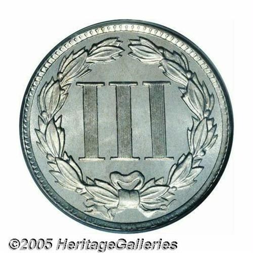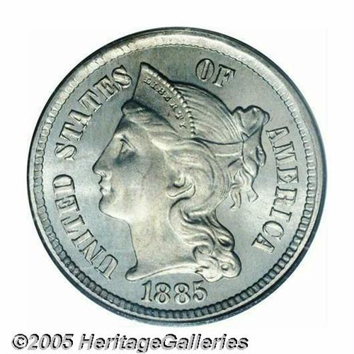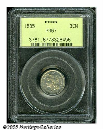 <B>1885<3CN> PR67 PCGS.</B></I> The obverse of this expertly preserved Three Cent Nickel proof is splashed in light pumpkin-orange patina, while just a trace of golden color is noticed on the placid, well mirrored reverse. Population: 26 in 67, 1 finer (5/05).<BR><I>From The Western Hills Collection.</B></I>