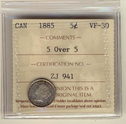 1885 5¢ 5 Over 5 ICCS VF30. Scarce variety.