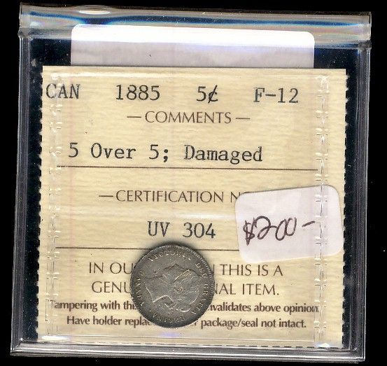 1885 5¢ 5 over 5 ICCS F12. Shows some light damage.