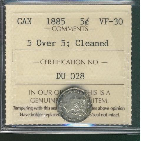 1885 5¢ 5 over 5 ICCS VF30. Designated, Cleaned.