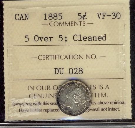 1885 5¢ 5 over 5 ICCS VF30. Designated, Cleaned.