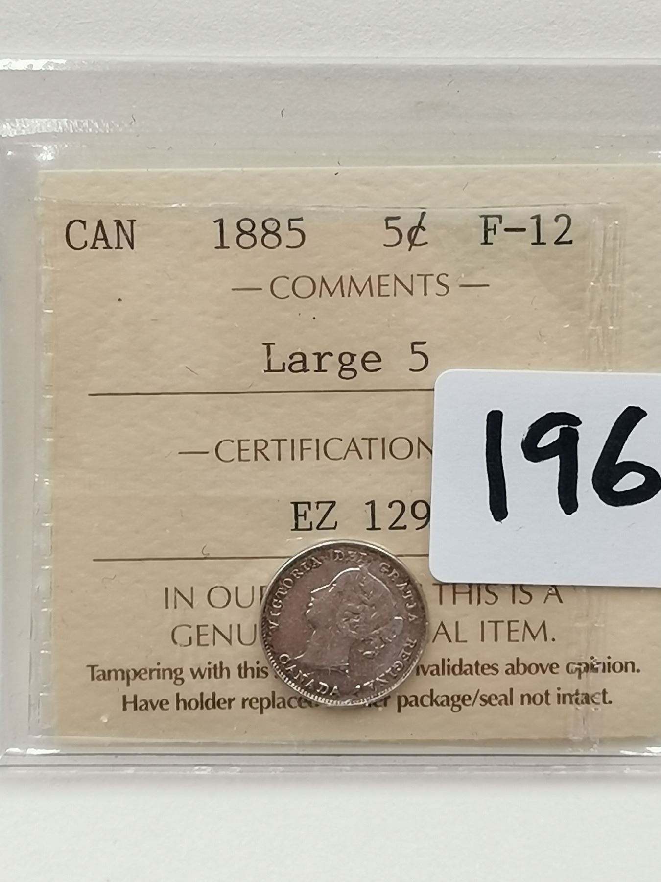 1885 5 Cent, LARGE 5, F12 CERTIFY