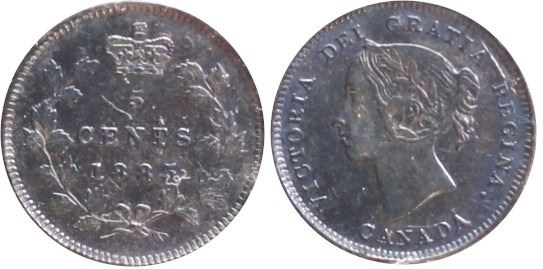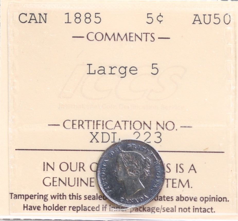 1885 5¢ Large 5 ICCS About Uncirculated-50.