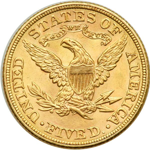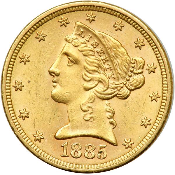 1885. NGC graded MS-64. Lightly toned. There is a lovely interplay between pale orange-gold and reddish colors that give this the eye appeal of an even higher grade. Devices are sharp in all areas, including stars. A few light bagmarks (PCGS # 8367) .