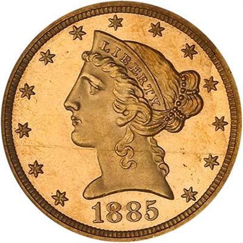This glittering 1885 Liberty half eagle, a cameo frosted beauty, takes its place at the Master of Ceremony's table among roster of surviving choice Proof gold coins in the present century. The devices are very crisp and are, for that matter, very frosty, accenting the portrait, eagle, and other features against a field of "orange peel" mirror beauty, characteristic of gold of this period. We don't know why, but for some reason the orange-peel effect is not as prevalent on the copper or silver Proofs.