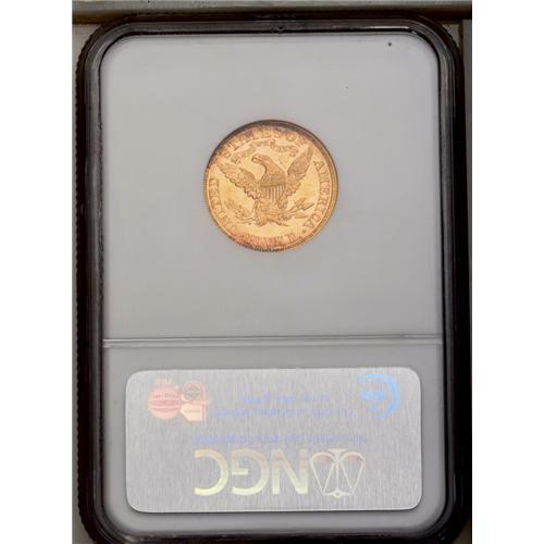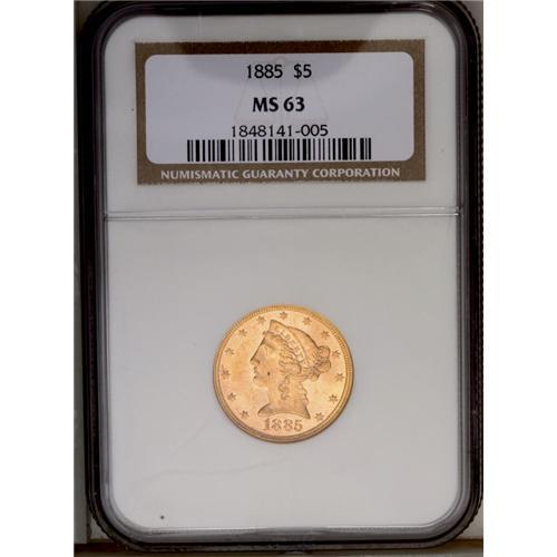 <B>1885<$5> MS63 NGC.</B></I> Bright apricot-gold surfaces display fields with prooflike tendencies and sharply defined motifs. Scattered light abrasions, mostly on the obverse, preclude a higher grade. A small dark spot, possibly grease, is located on Liberty's cheek.