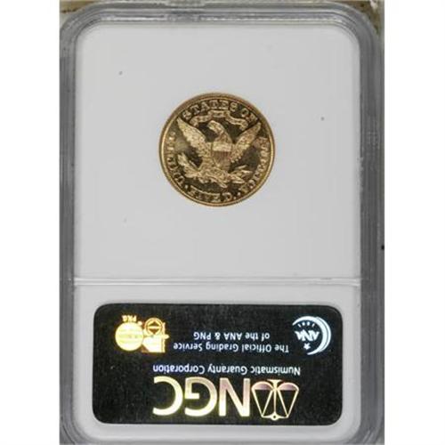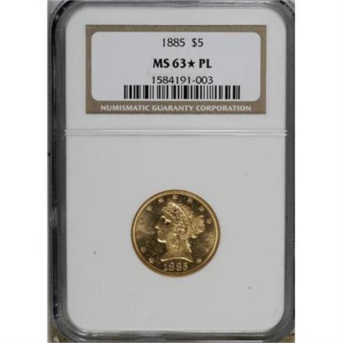 <B>1885 $5 MS63 </B></I><img src="/images/star.gif" width="10" height="10" alt="" border="0"><B> Prooflike NGC.</B></I> A recently certified piece that does not yet appear in the <I>Census Report</B></I>, as of (2/08); when it does, it will be the only Star example out of five Select Prooflike coins, with none finer. This boldly struck coin is distinctly reflective with lightly abraded lemon-gold surfaces.<BR><BR><B>Coin Engraver:</B> Christian Gobrecht<BR><BR><b>Shipping:</b> Coins & Currency (<a target="_blank" href="http://www.heritageauctions.com/common/shipping.php">view shipping information</a>)