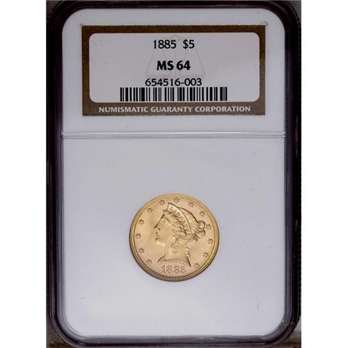 <B>1885<$5> MS64 NGC.</B></I> A lustrous and sharply struck representative that has bright red-gold color. The obverse has a few faint marks, while the reverse is better preserved and nearly blemish-free. NGC has certified nine coins finer (3/06).