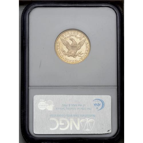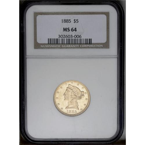 <B>1885 $5 MS64 NGC.</B></I> Adorned over each side by deep orange-rose patina, with a modest number of luster grazes and small blemishes in the fields. The 1885 half eagle is not a difficult issue in lower Mint State grades, but those grading MS64 are rarely seen, and Gems are virtually unobtainable.