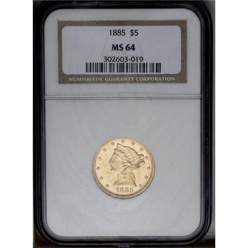 1885 $5 MS64 NGC. Frosty and bright, with pleasing pin