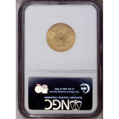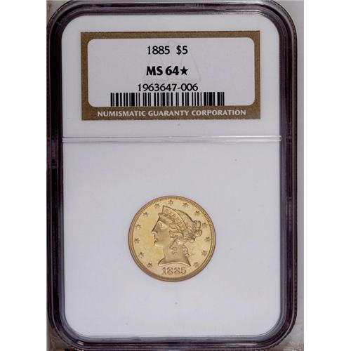 <B>1885 $5 MS64 <img border='0' src='http://www.heritagecoins.com/images/star.gif' width=10 height=10> NGC.</B></I> The reverse displays normal cartwheel luster, but the obverse is noticeably prooflike, which apparently secured the <img border='0' src='http://www.heritagecoins.com/images/star.gif' width=10 height=10> designation from NGC. This well struck Half Eagle has a few wispy slide marks on the obverse field but is otherwise exceptional.
