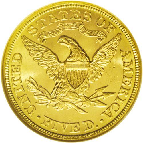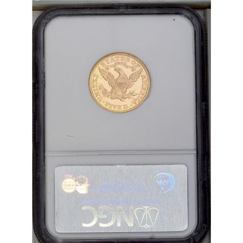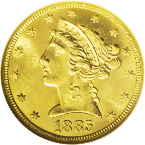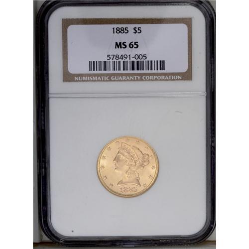 <B>1885<$5> MS65 NGC.</B></I> This is one of the better examples of the date to be certified. NGC and PCGS have combined to certify 12 Gem quality MS65s, as well as two coins finer. This is one of those condition rarities that is common enough in lower grades but proves to be nearly impossible to locate in Gem grades. This specimen portrays flashy brassy-gold surfaces with dazzling luster, and the design elements are attentively struck. The handful of miniscule marks scattered about are inoffensive. Census: 8 in 65, 1 finer (7/06).