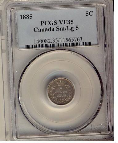 1885 5¢ Sm/Lg 5¢ PCGS VF35. 5 over 5 Vruety. Attractive variety with remaining lustre.