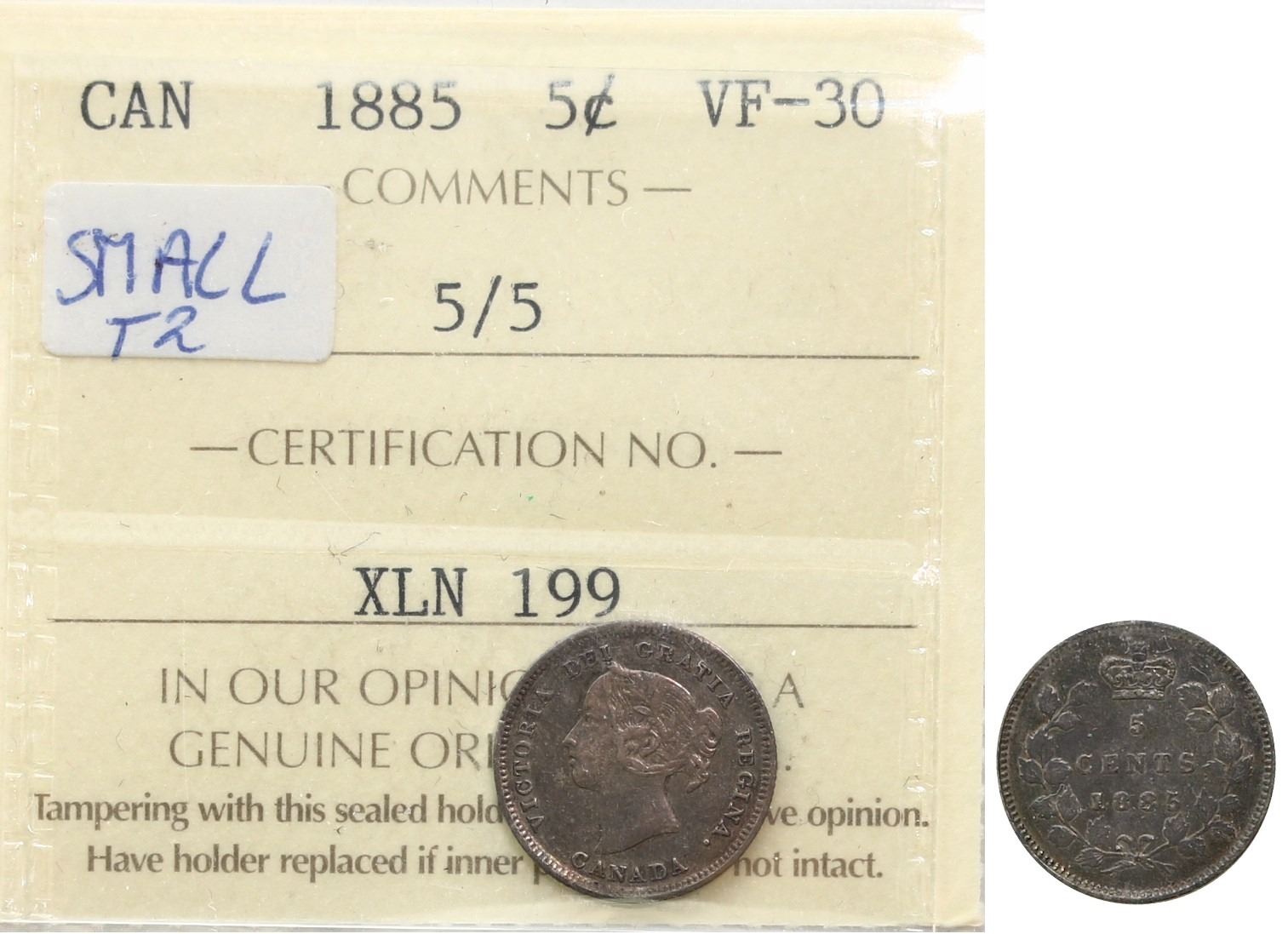 1885 5¢ "Small 5/5" ICCS Choice Very Fine-30. Lightly toned. Very scarce variety seldom offered.