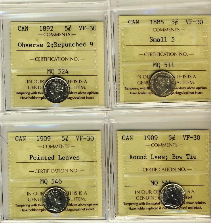 1885 5¢ Sml 5, 1892 Obv 2 Repunch, 1909 RL, Bow Tie & 1909 Ptd Lvs ICCS VF30. Lot of 4 coins.