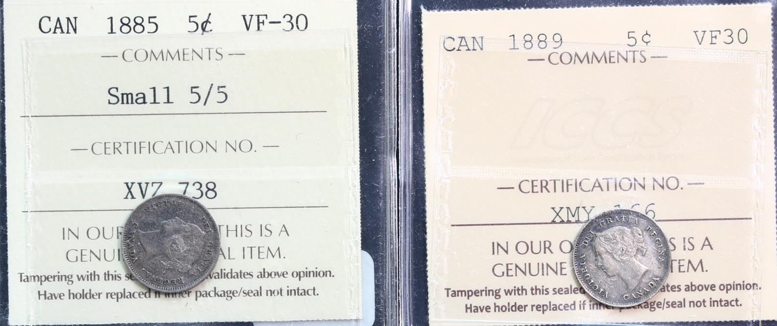 1885 5¢ Sml 5/5 & 1889 ICCS Choice Very Fine-30. Lot of 2 coins.