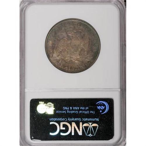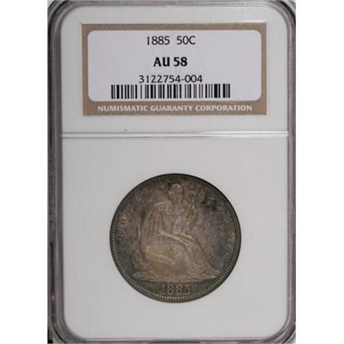 <B>1885 50C AU58 NGC.</B></I> Vibrant blue, violet, and peach-gold patina drapes each side of this elegant and strongly lustrous near-Mint Seated half. Carefully preserved save for a hint of highpoint friction.<BR><BR><B>Coin Engraver:</B> Christian Gobrecht<BR><BR><b>Shipping:</b> Coins & Currency (<a target="_blank" href="http://www.heritageauctions.com/common/shipping.php">view shipping information</a>)