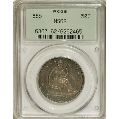 <B>1885 50C MS62 PCGS.</B></I> The 1885 has one of the lowest business strike mintages in the entire Liberty Seated Half Dollar series with only 5,200 pieces produced. This is a sharply struck and satiny example with chestnut-gold, sea-green, and plum-red toning. Housed in an old green label holder.<BR><BR><b>Shipping:</b> Coins & Currency (<a target="_blank" href="http://www.heritageauctions.com/common/shipping.php">view shipping information</a>)