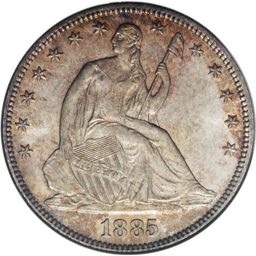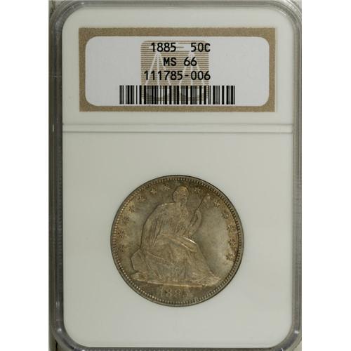 <B>1885 50C MS66 NGC.</B></I> One would think the Mint would have gone to the trouble to coin more than $2,600 face value in business strike half dollars in 1885, but they were apparently preoccupied with Morgan dollars, and didn't want the proof Seated silver coins of the time to become instant rarities. This piece is among the finest handful of survivors, with silver-gray and amber-gold obverse toning deepening to orange and russet on the reverse. Census: 4 in 66, 0 finer (12/06).<BR><BR><b>Shipping:</b> Coin/Currency (<a target="_blank" href="http://www.heritageauctions.com/common/shipping.php">view shipping information</a>)