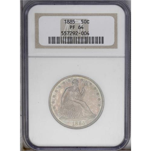 <B>1885<50C> PR64 NGC.</B></I> A veneer of orange-gold, mauve, and cobalt-blue patina bathes each side, taking on deeper hues on the obverse. A strong motif-field contrast is evident when the coin is tilted under a light source, even on the obverse, where the field reflectivity is somewhat subdued by the depth of the toning. Excellent definition is apparent on the design elements, and there are no significant marks to report. Census: 80 in 64, 59 finer (4/06).