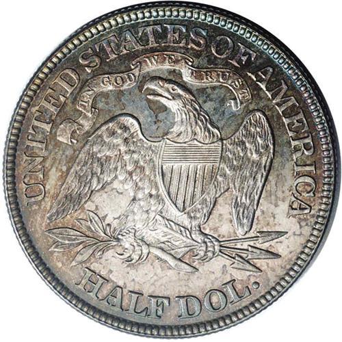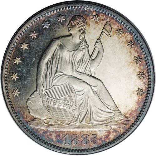 <B>1885<50C> PR64 NGC.</B></I> Deeply mirrored with a moderate amount of frost on the obverse devices. The obverse exhibits rich russet-rose and cobalt peripheral toning, with a noticeable cameo effect, while the reverse is more darkly hued in russet, crimson, smoky-lilac and electric-blue coloration. A popular, low total mintage date.
