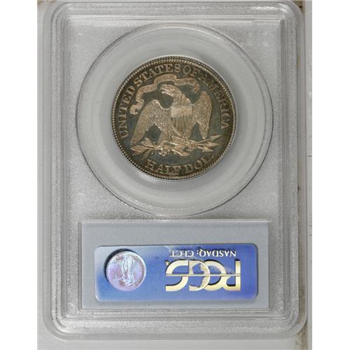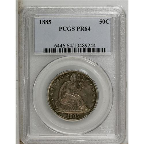 <B>1885<50C> PR64 PCGS.</B></I> Cloudy orange, russet, and lavender toning saturates the obverse fields, while the reverse has thinner orange patina. The fields around the eagle fuel contrast and have minor hairlines.