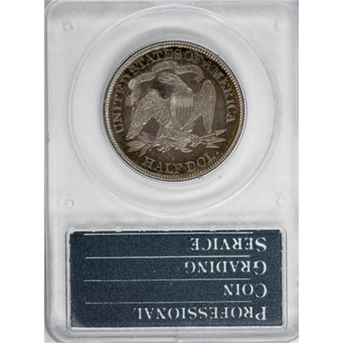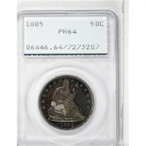<B>1885 50C PR64 PCGS.</B></I> Gorgeously toned in a sophisticated blend of olive-green and bronze that upon rotation, intensifies to vibrant citrine, sapphire, and gold tones. Well struck and generously reflective. Housed in a first generation PCGS holder. <BR><BR><B>Coin Engraver:</B> Christian Gobrecht<BR><BR><b>Shipping:</b> Coins & Currency (<a target="_blank" href="http://www.heritageauctions.com/common/shipping.php">view shipping information</a>)